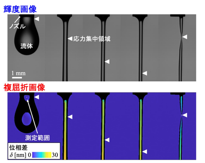 名古屋工業大学の研究グループは、液滴の落下によって一軸伸長流れをつくり出し、高速度偏光カメラを用いた「全視野伸長レオ・オプティクス計測技術」を開発した(ニュースリリース)。 液体の中には、流れると形を変える複雑流体と呼ば…