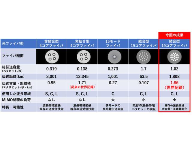 伝送能力の一般的な指標である伝送容量と距離の積に換算すると,1.86Eb/s・kmとなり,これは標準外径光ファイバの世界記録となるという。