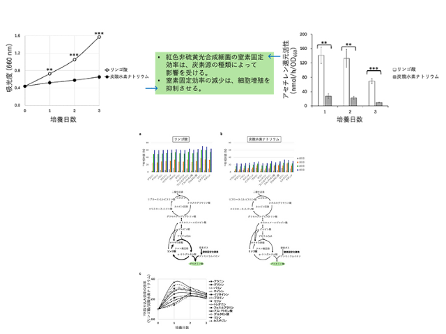 理化学研究所と京都大学は,海洋性の紅色非硫黄光合成細菌の窒素固定化効率や固定化された窒素の代謝経路が,環境中の炭素源の種類に応じて変化し,細胞増殖速度に影響することを明らかにした(ニュースリリース)。