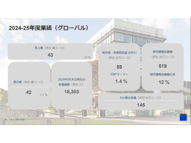トルンプは,2024–25年度業績や今後の事業戦略に関して発表した。世界全体の売上高は43億ユーロで前年度比16%減,受注高は7.2%減の42億ユーロになったという。