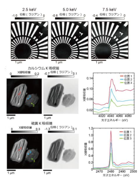 この装置をNano TerasuのビームラインBL10Uに設置し、テスト試料の測定を行ったところ、2.5keVで38.7nm、5.0keVで13.4nm、7.5keVで16.1nmの分解能が得られた。また、硫酸カルシウム試料のカルシウムおよび硫黄のK吸収端付近でのナノメートルスケールでの像再生および数十nmスケールのX線吸収スペクトルの取得に成功した。