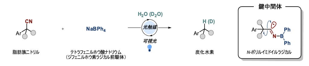 研究グループは、市販のジフェニルホウ素ラジカル前駆体(テトラフェニルホウ酸ナトリウム)と脂肪族ニトリルを、光触媒存在下で可視光照射することにより、シアノ基(CN)を水素原子に置き換えることに成功した。