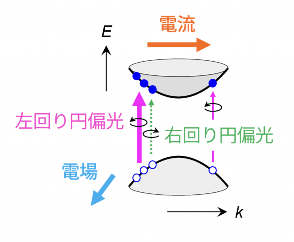 しかし、研究が進む中で、実際の電流に寄与するのはこのメカニズムだけではないことが分かってきた。もともと空間反転対称性を持たない物質では、円偏光を吸収するだけで電流が流れるという円偏光ガルバノ効果が知られている。空間反転対称性は外から電場を加えることによっても破れるため、円偏光と電場を同時に加える実験配置では、時間反転対称性の破れによる異常ホール効果と空間反転対称性の破れによる円偏光ガルバノ効果が競合することになった。しかしながら後者は発見から日が浅く、詳細は未解明のままとなっていた。