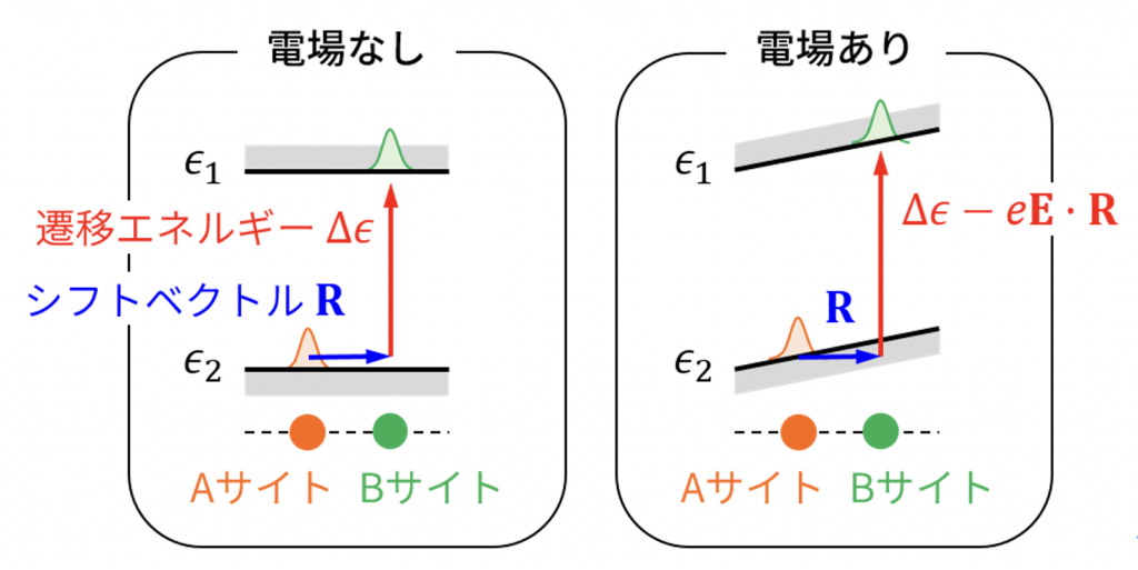 従来ばらばらに議論されていたこれらの現象を統一的に記述し、電場下で起こる円偏光ガルバノ効果の起源を解き明かした。先述した波動関数の幾何学的構造はベリー曲率という量によって定量化されるが、これは左回り・右回り円偏光に対する吸収率の差(円二色性)を生む働きもする。外部電場は波動関数の混成を通じてベリー曲率を変調するため、それによる円二色性が円偏光ガルバノ効果を引き起こすことが理論的に示された。さらに、ベリー接続と呼ばれる別の幾何学的量が関与することも判明した。ベリー接続は光学遷移の過程で電子雲を空間的に動かす働きをするが、外部電場の下ではその移動距離に対応したポテンシャルエネルギーが遷移エネルギーに加算される。この変化も運動量空間における円二色性の起源となる。
