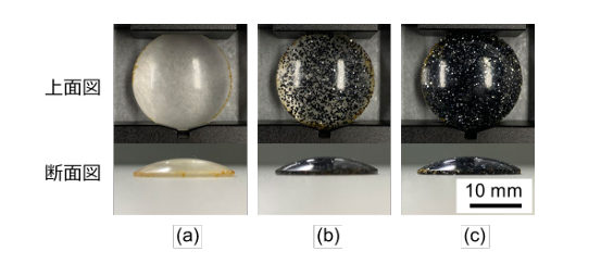 (b) シリコン粒子濃度 5%で作製したテラヘルツレンズ。(c) シリコン粒子濃度
