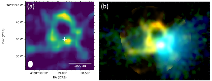 香川大学の研究グループは、アルマ望遠鏡の高周波受信機(Band9)で高密度分子雲コアを観測し、原始星およびその円盤のすぐそばに約1000天文単位の直径をもつリング状ガス雲が存在することを初めて明らかにした(ニュースリリース)。