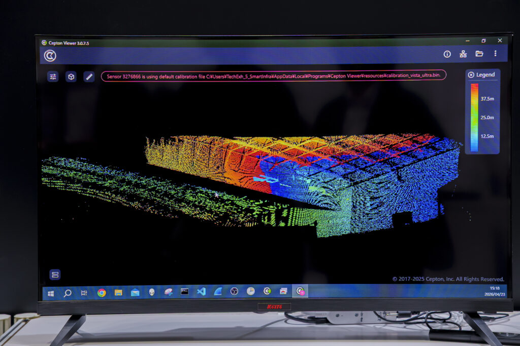 一方、長距離タイプは最大300mの検知距離を実現する。取得される点群データの解像度が高く、対象物の形状をより精緻に把握できる点が強みだ。ブースでは実際のデモ映像も公開されている。
