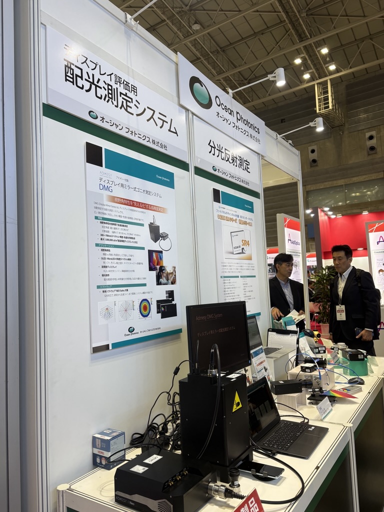 同社ブースではDMGに加え、世界的なシェアを誇るOcean Insight(旧オーシャンオプティクス)社製のファイバマルチチャンネル分光器の多彩なラインアップも展示の中心となっている。ユーザー自身でスリット交換が可能なスタンダードモデル「Ocean SR4」をはじめ、900〜2500nmの広帯域に対応し高感度ハイゲインモデルも選択できる近赤外用の「Ocean NR」、装置組込みに特化した超コンパクトな「Ocean ST」、そして電子冷却式ディテクタにより蛍光・ラマン分光などの微弱光計測に最適な「QE Pro」まで、研究開発から量産ラインまであらゆるニーズに応える製品群が揃う。さらに、フラッシュランプの測定に対応したInternational Light Technologies社製のハンドヘルドライトメータ「ILT2500」や、紫外から赤外まで高い反射率と拡散性を維持するLabsphere社製の「スペクトラロン標準反射板」および積分球システムなど、光計測に必要な周辺機器も含めたトータルな提案が行われている。専門スタッフによる技術相談も随時受け付けており、ディスプレイ計測の高度化や分光システムの最適化を目指す技術者にとって、実機を通じた具体的な課題解決の場となっている。